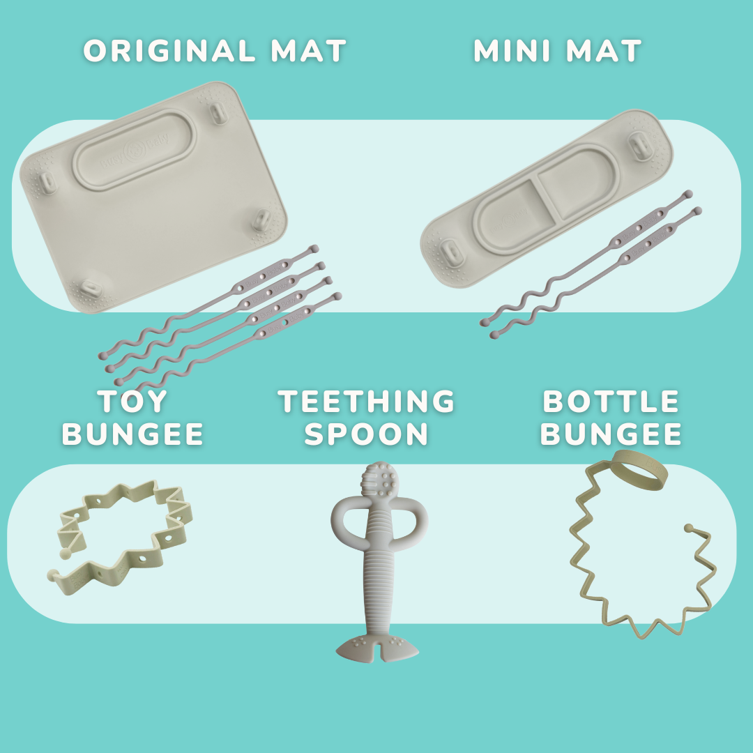 Whether used during playtime or mealtime, our Mat with tether & bungee system supports sensory development, helps build fine motor skills and problem-solving skills. Our feeding accessories, especially our Teether & Training Spoon, are uniquely designed to support baby-led weaning and feeding independence.