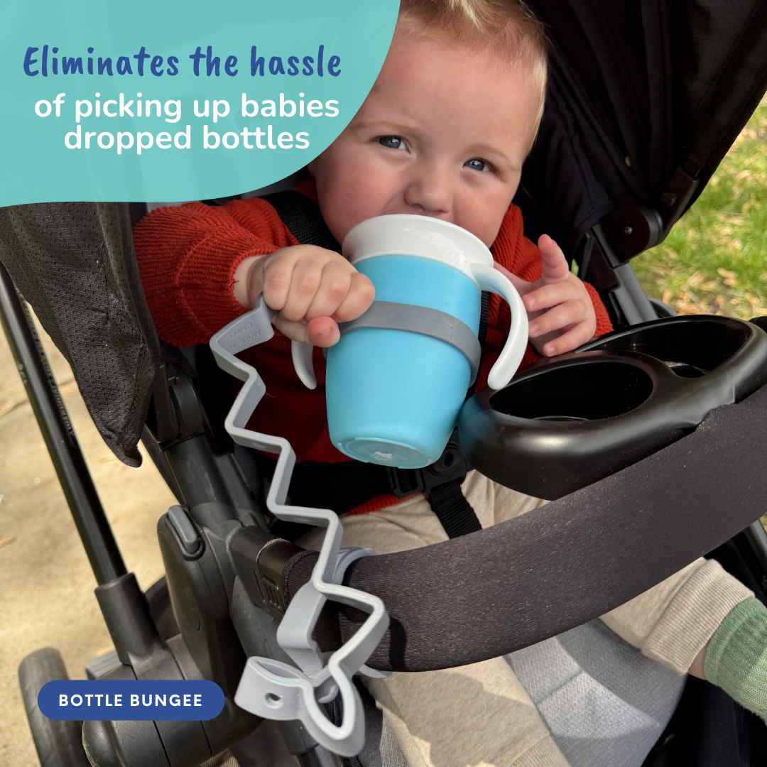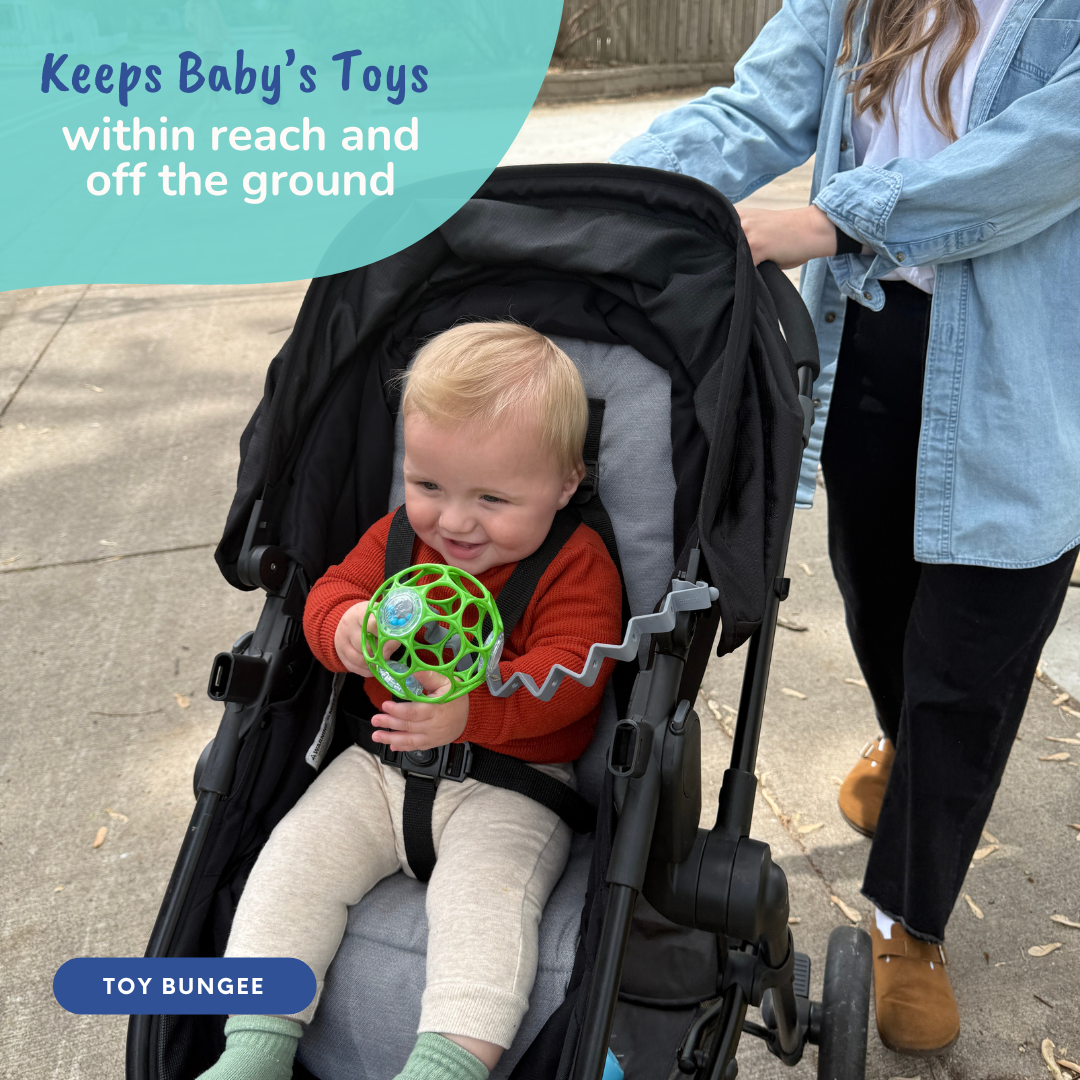 Our patented tether system keeps your baby´s things within their reach! Our Bungees are specially designed to hold bottles, cups, or larger toys. This keeps babies more engaged and eliminates the hassle of picking up their dropped items over and over again!