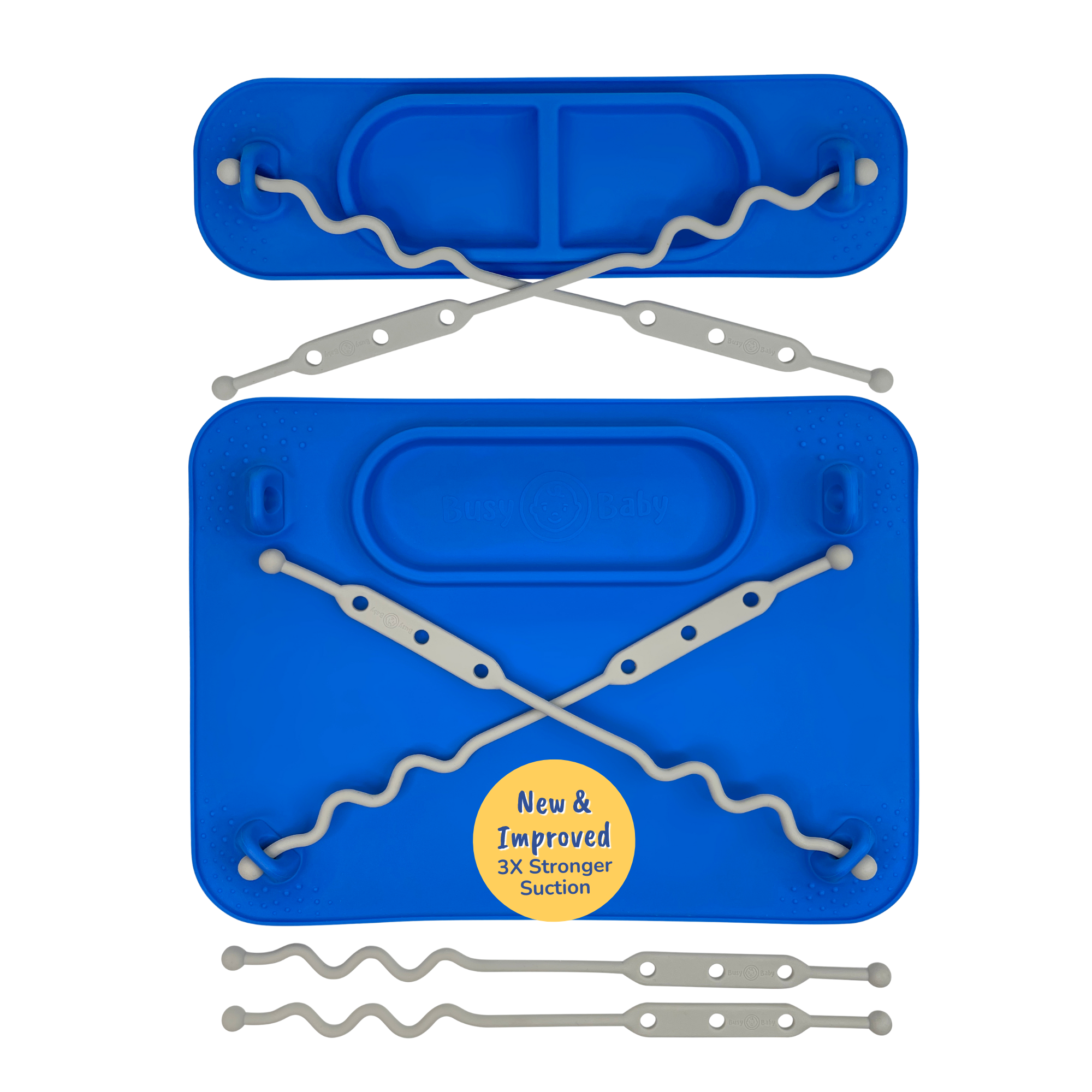 New and Improved - 3x stronger suction! The Busy Baby Original & Mini Mat Bundle pairs our signature placemats to give you maximum flexibility at home and on-the-go. The Original Mat's larger surface (11.5" x 8.5") is perfect for highchairs and tables, while the compact Mini Mat (11" x 3") excels in tight spaces like stroller trays and airplane tray tables. *Will not work with Stokke Tripp Trapp or Lalo trays