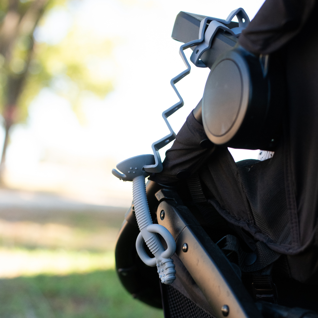 Our patented tether system keeps your baby´s things within their reach! Our Bungees are specially designed to hold bottles, cups, or larger toys. This keeps babies more engaged and eliminates the hassle of picking up their dropped items over and over again!